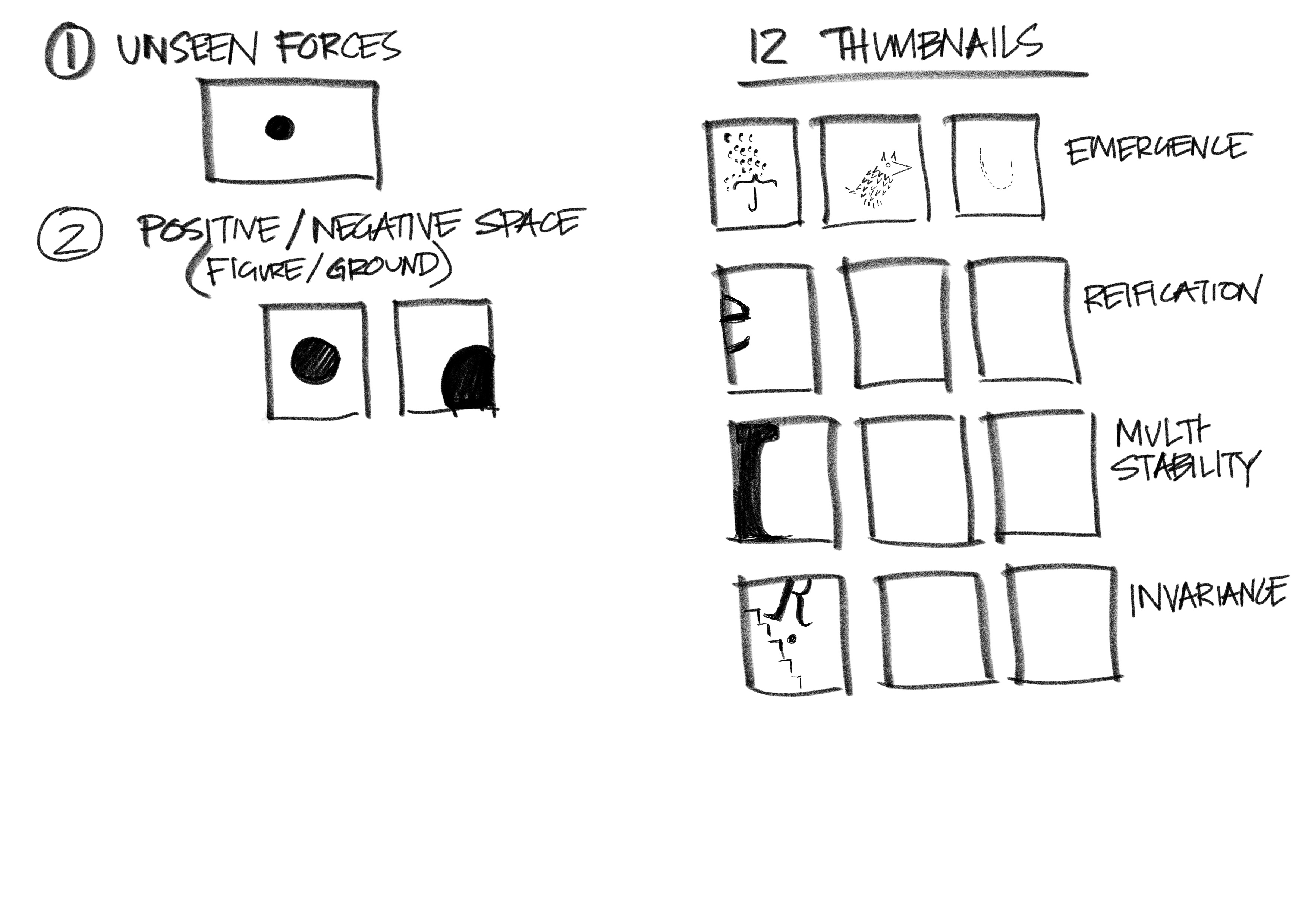 Projects begin with thumbnail drawings in a sketchbook (or ipad, other) to develop concepts, and then these concept drawings are presented to small groups to brain storm ideas in order to optimize the concept and image.